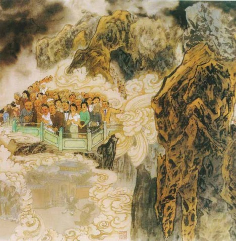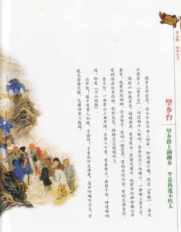 阎罗王开宏恩,传令牛头马面二将军,押领诸亡魂,照过“孽镜,善良不用登上”望乡台“,功过相半入轮回,其余死不了回魂心,一律都上望乡台。望乡台,一面靠山三面开阔,方圆八十里,悬崖耸立,垂壁千仞,峥嵘嶙峋间,既是”刀山地狱“。