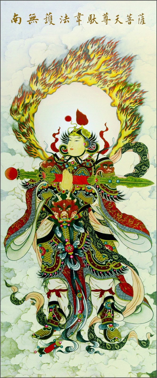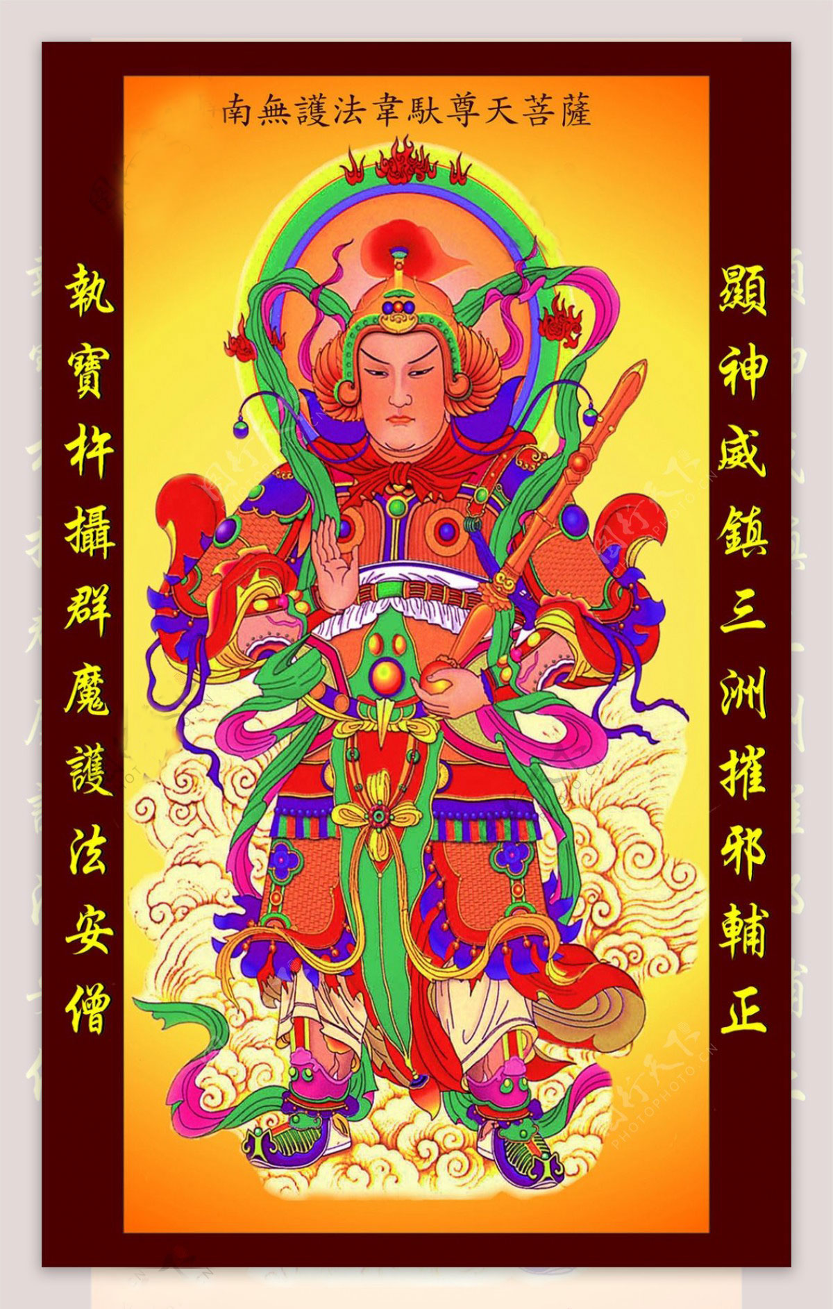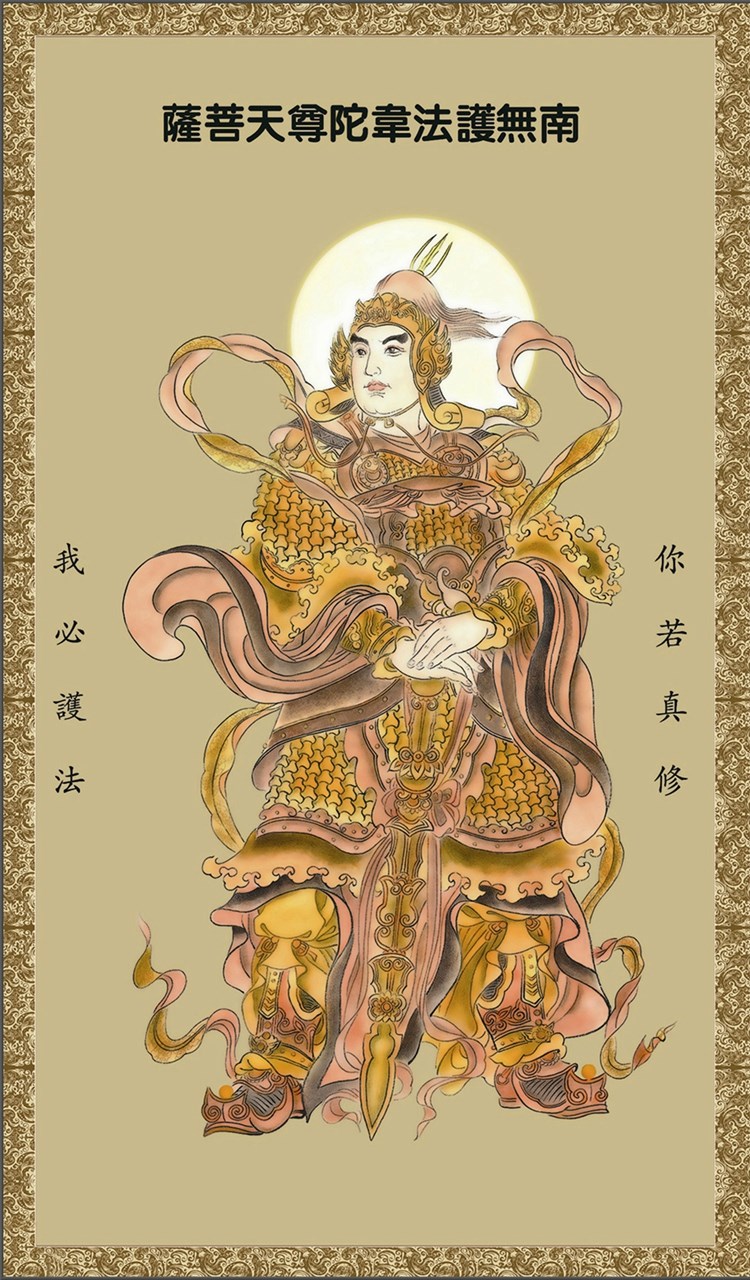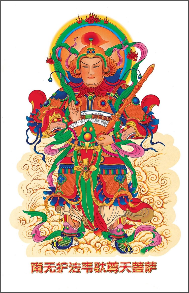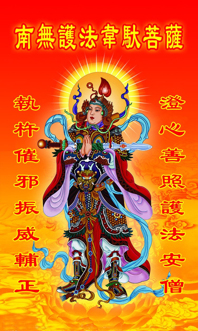韦驮菩萨,为四天王座下三十二将之首,也是佛教护法神。寺院中,韦驮菩萨像常威武地立於最靠近寺院门口的四天王殿内,面向著寺院,以守护伽蓝(即道场)。其形像大多为身穿甲胄的雄壮武将,佛教护法是不用宝剑的,韦陀菩萨执的是伏魔杵。