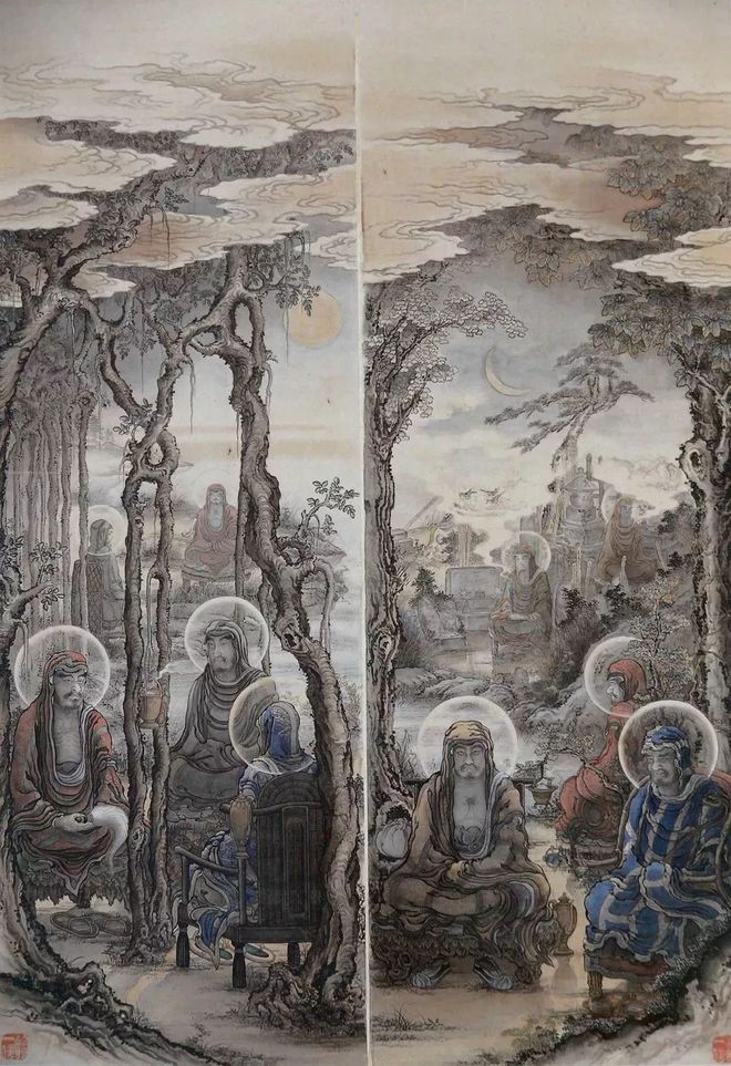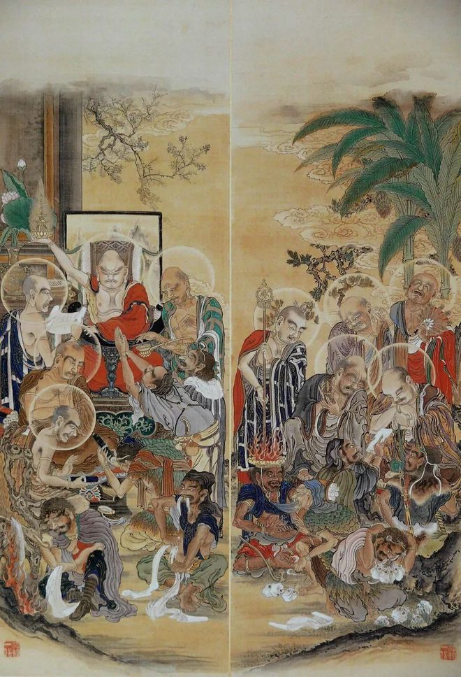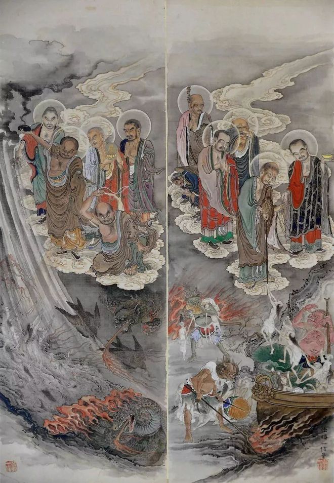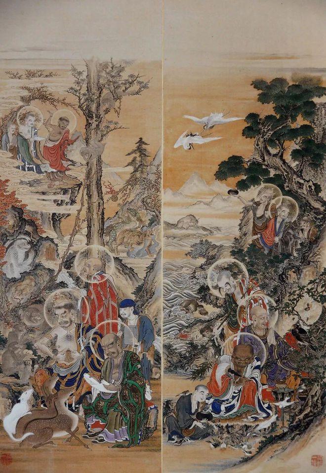 在50幅作品中有六处盖有《法眼一信笔》的署名印章。因狩野一信于1862年被授予“法眼和上位”(日本授予僧人的位阶等级,最高僧位是-法印大和尚位,法眼位是第二位,第三位是-法桥上人位,共三个阶位。)所以东博本五百罗汉图完成的时间应该是在1862年之后。