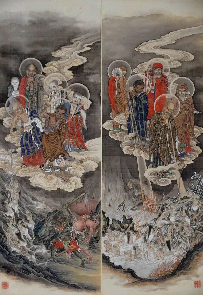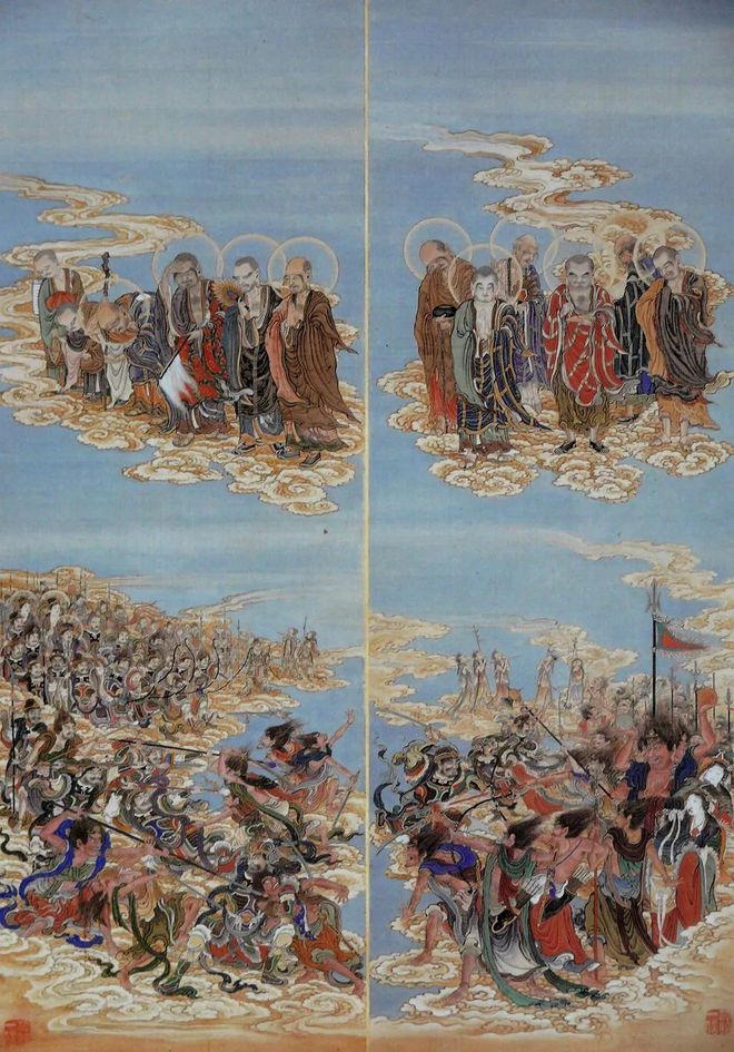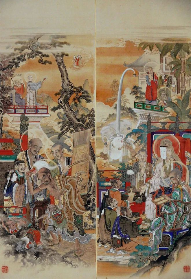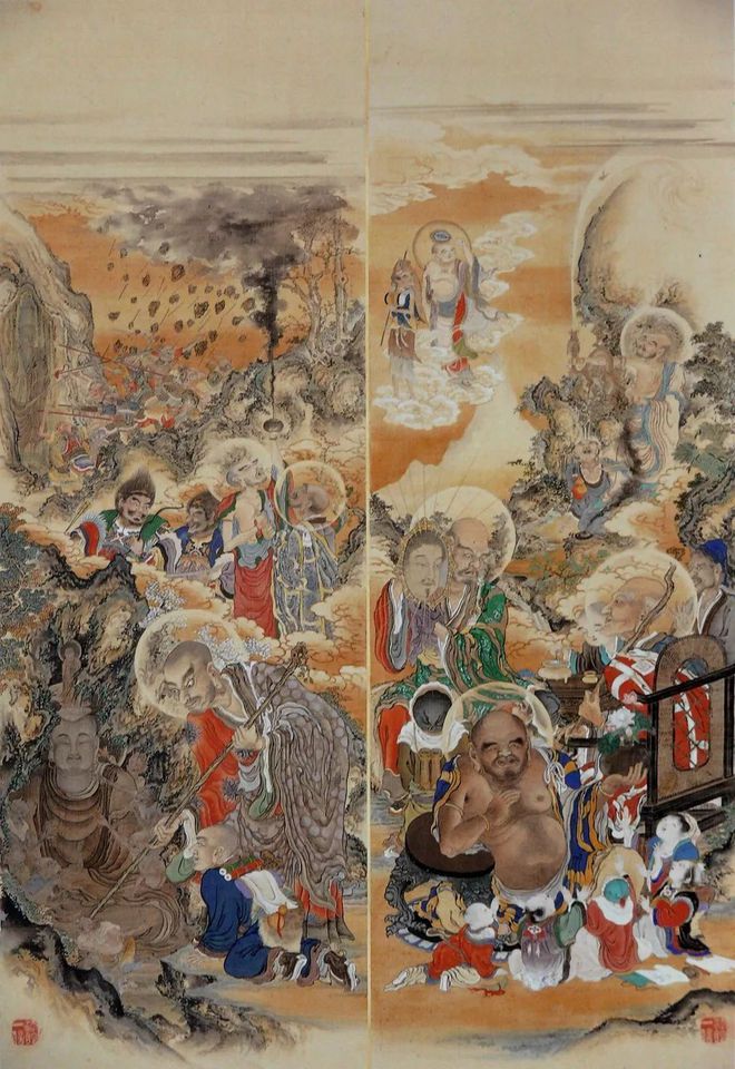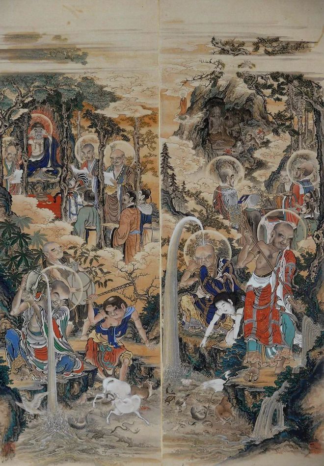 东京都港区芝的增上寺的五百罗汉图(100幅图 简称:增上寺本)是幕府末期的画师狩野一信的代表作品。作为这套增上寺本的五百罗汉图的姊妹篇,另一套狩野一信所绘的五百罗汉图被珍藏在东京国立博物馆内,被称之为《东博本》。