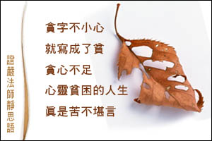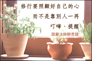 他说:「我的眼睛虽然瞎了,可是我的手还能敲木鱼,腿还能打坐,嘴巴还能念佛,我能做的事还很多。人身可贵,我要尽量用我的身体好好修行。」