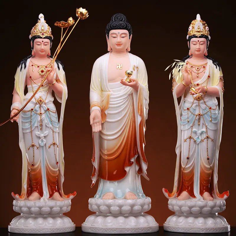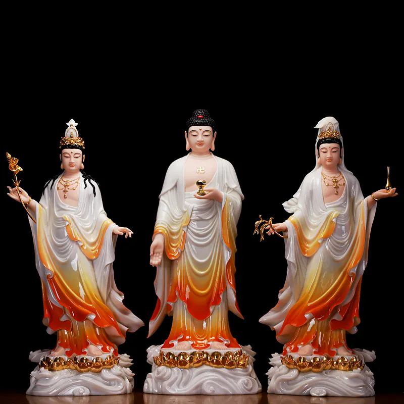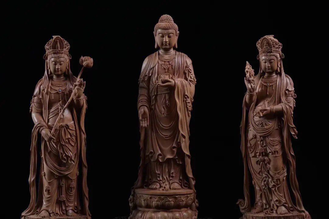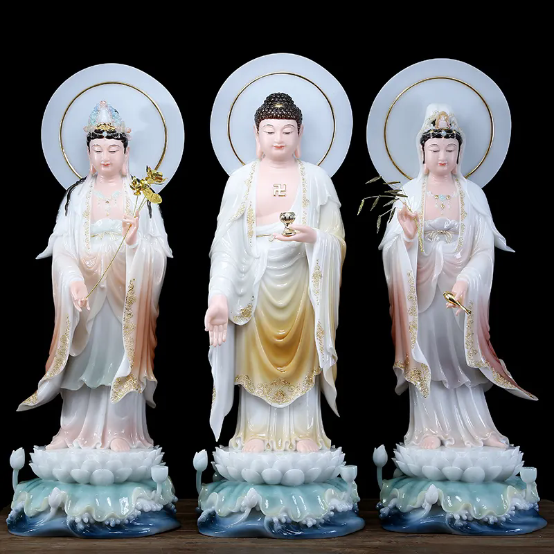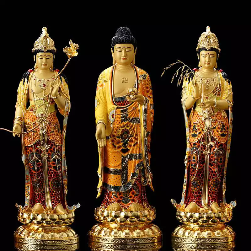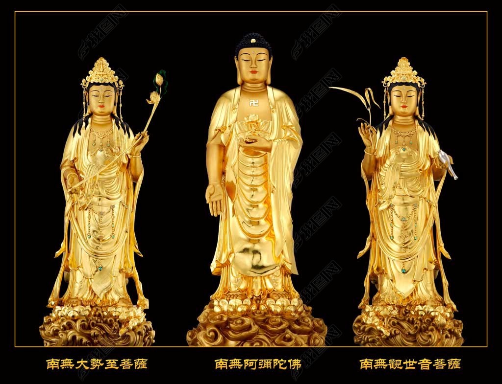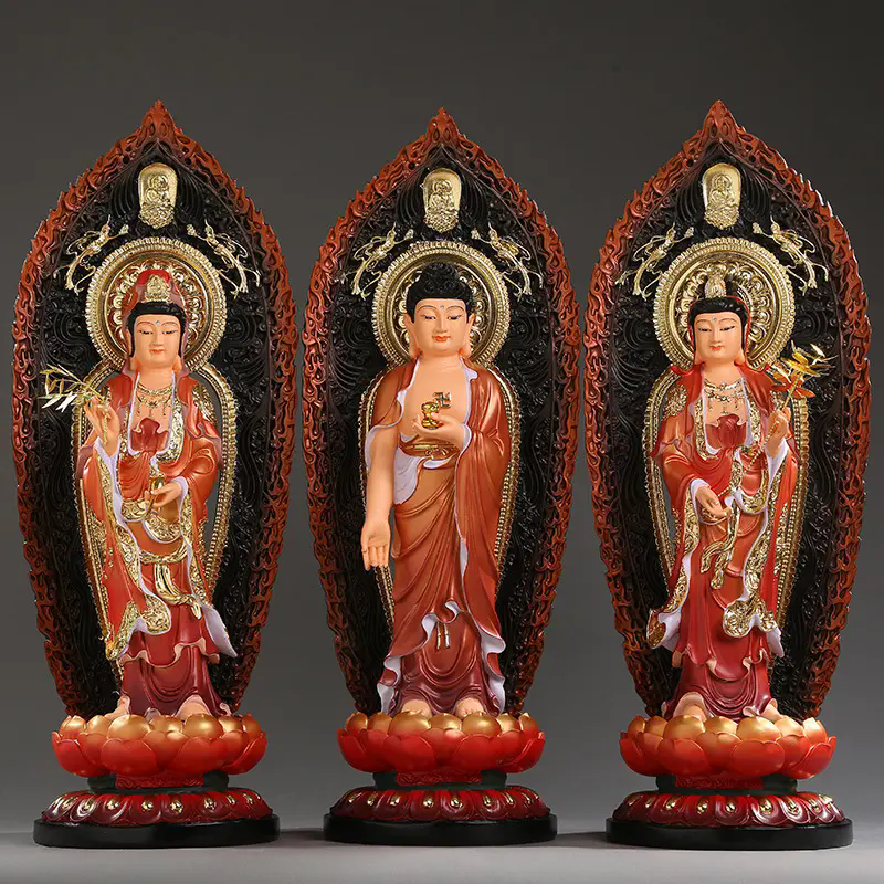西方三圣,又称阿弥陀三尊,由三位佛教圣人组成:阿弥陀佛、观世音菩萨和大势至菩萨。阿弥陀佛是西方极乐世界的主佛,象征着无量的光明、寿命和功德。观世音菩萨,又称观音菩萨,是慈悲与智慧的化身,被视为众生的救苦救难的菩萨。大势至菩萨,又称文殊菩萨,是智慧与智慧的化身,被视为智慧的菩萨。这三位圣人合称为“西方三圣”,在佛教信仰中具有重要的地位,被视为西方极乐世界的主要护法和救度众生的菩萨。
