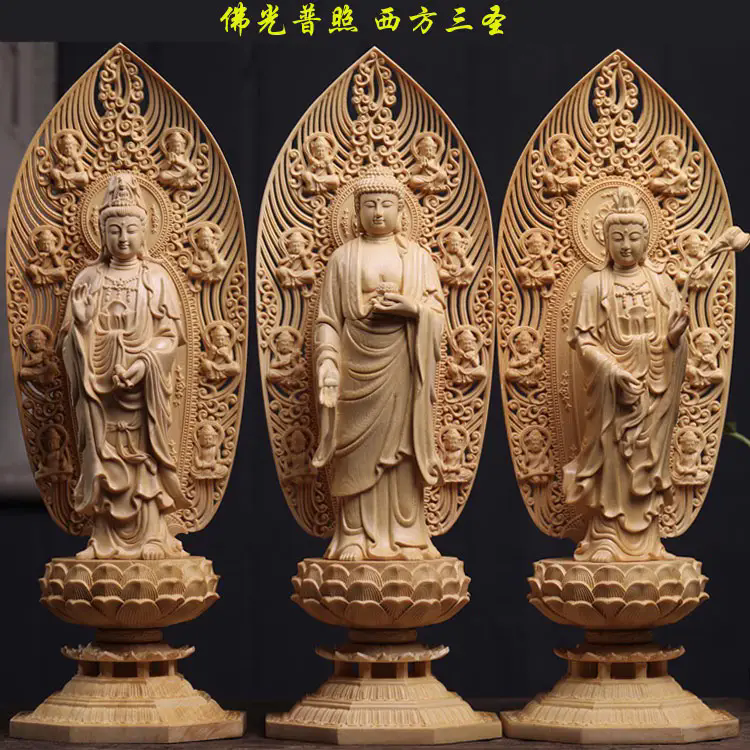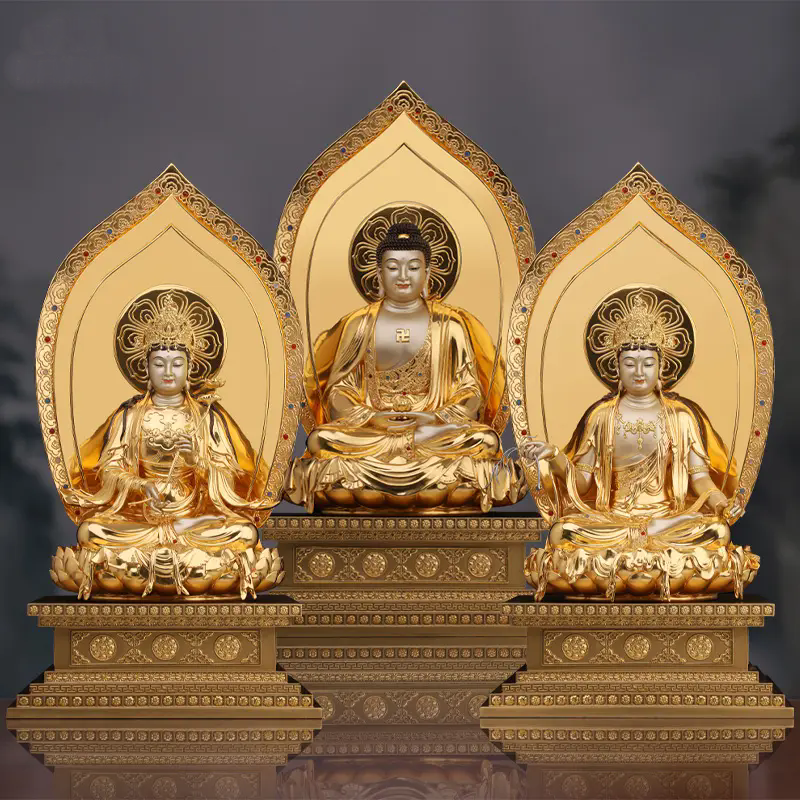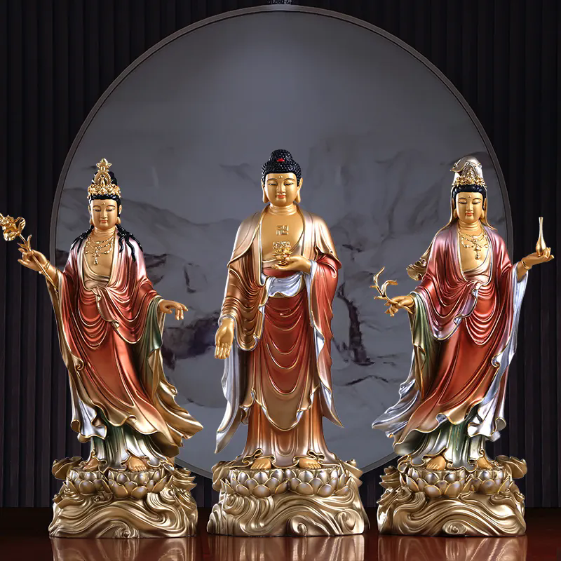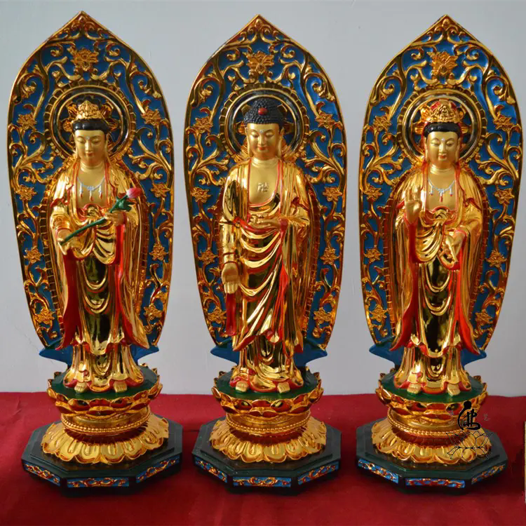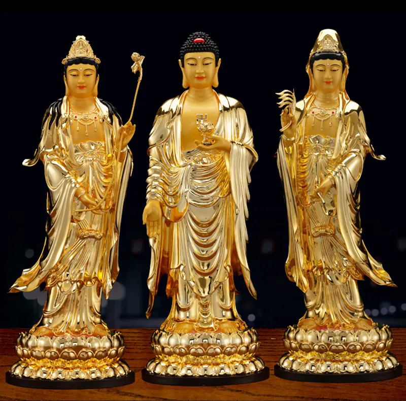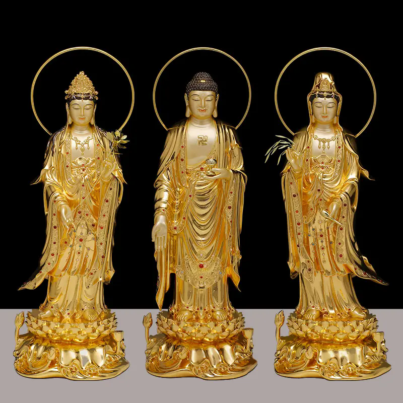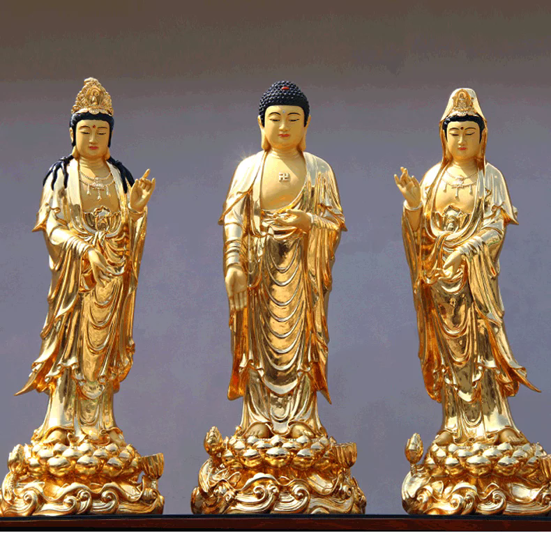 西方三圣,又称阿弥陀三尊,由三位佛教圣人组成:阿弥陀佛、观世音菩萨和大势至菩萨。阿弥陀佛是西方极乐世界的主佛,象征着无量的光明、寿命和功德。观世音菩萨,又称观音菩萨,是慈悲与智慧的化身,被视为众生的救苦救难的菩萨。大势至菩萨,又称文殊菩萨,是智慧与智慧的化身,被视为智慧的菩萨。这三位圣人合称为“西方三圣”,在佛教信仰中具有重要的地位,被视为西方极乐世界的主要护法和救度众生的菩萨。