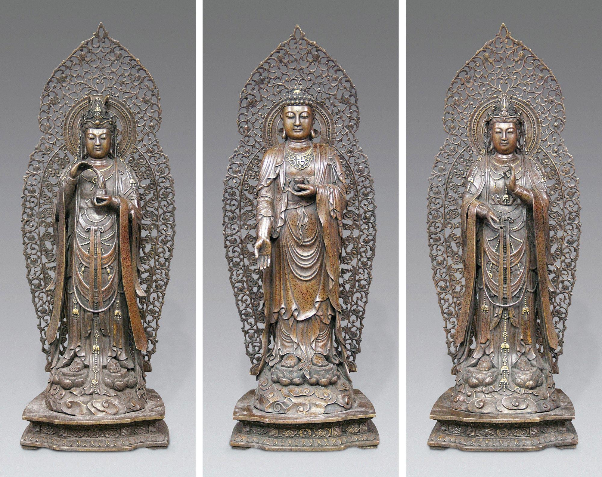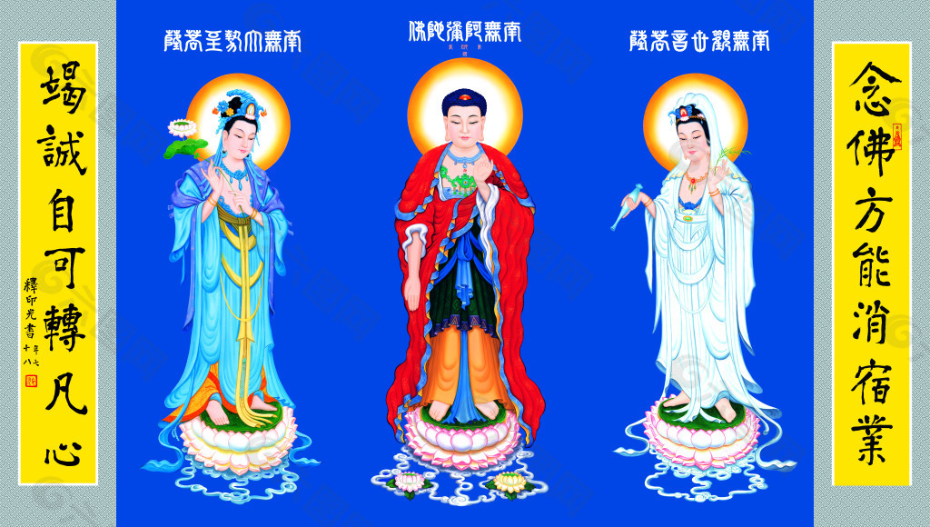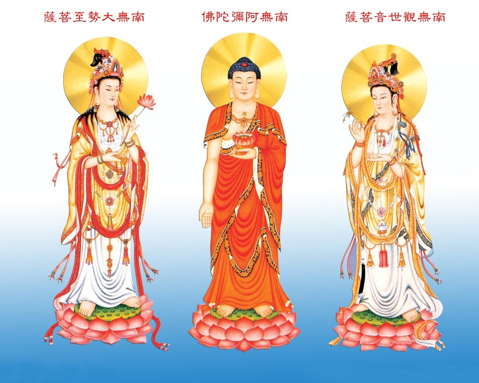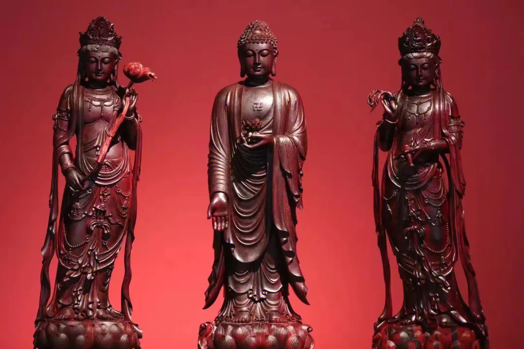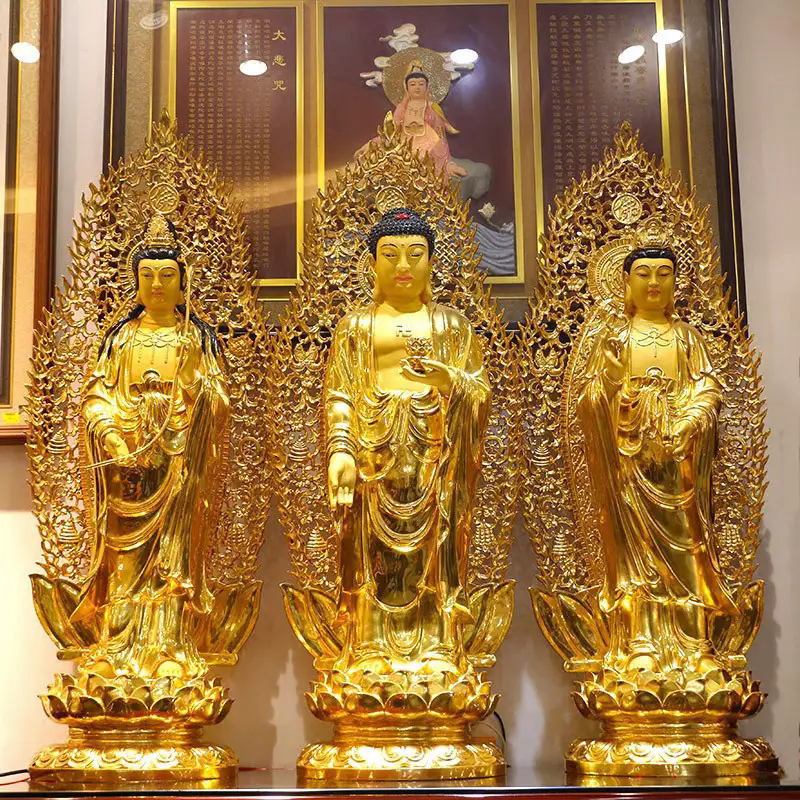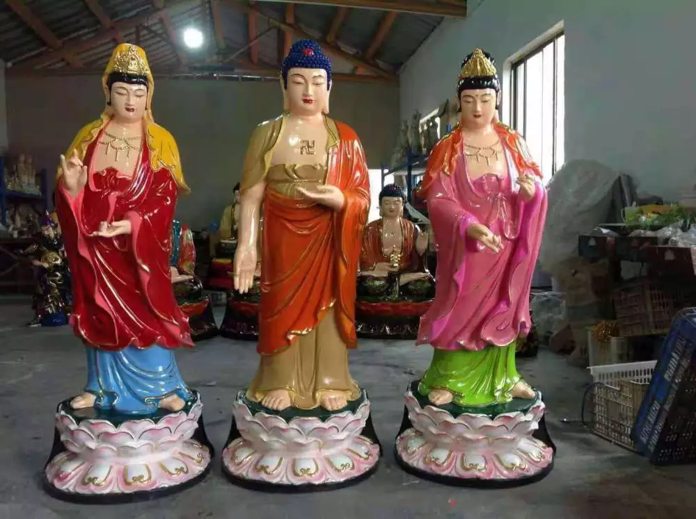 西方三圣,又称阿弥陀三尊,由三位佛教圣人组成:阿弥陀佛、观世音菩萨和大势至菩萨。阿弥陀佛是西方极乐世界的主佛,象征着无量的光明、寿命和功德。观世音菩萨,又称观音菩萨,是慈悲与智慧的化身,被视为众生的救苦救难的菩萨。大势至菩萨,又称文殊菩萨,是智慧与智慧的化身,被视为智慧的菩萨。这三位圣人合称为“西方三圣”,在佛教信仰中具有重要的地位,被视为西方极乐世界的主要护法和救度众生的菩萨。