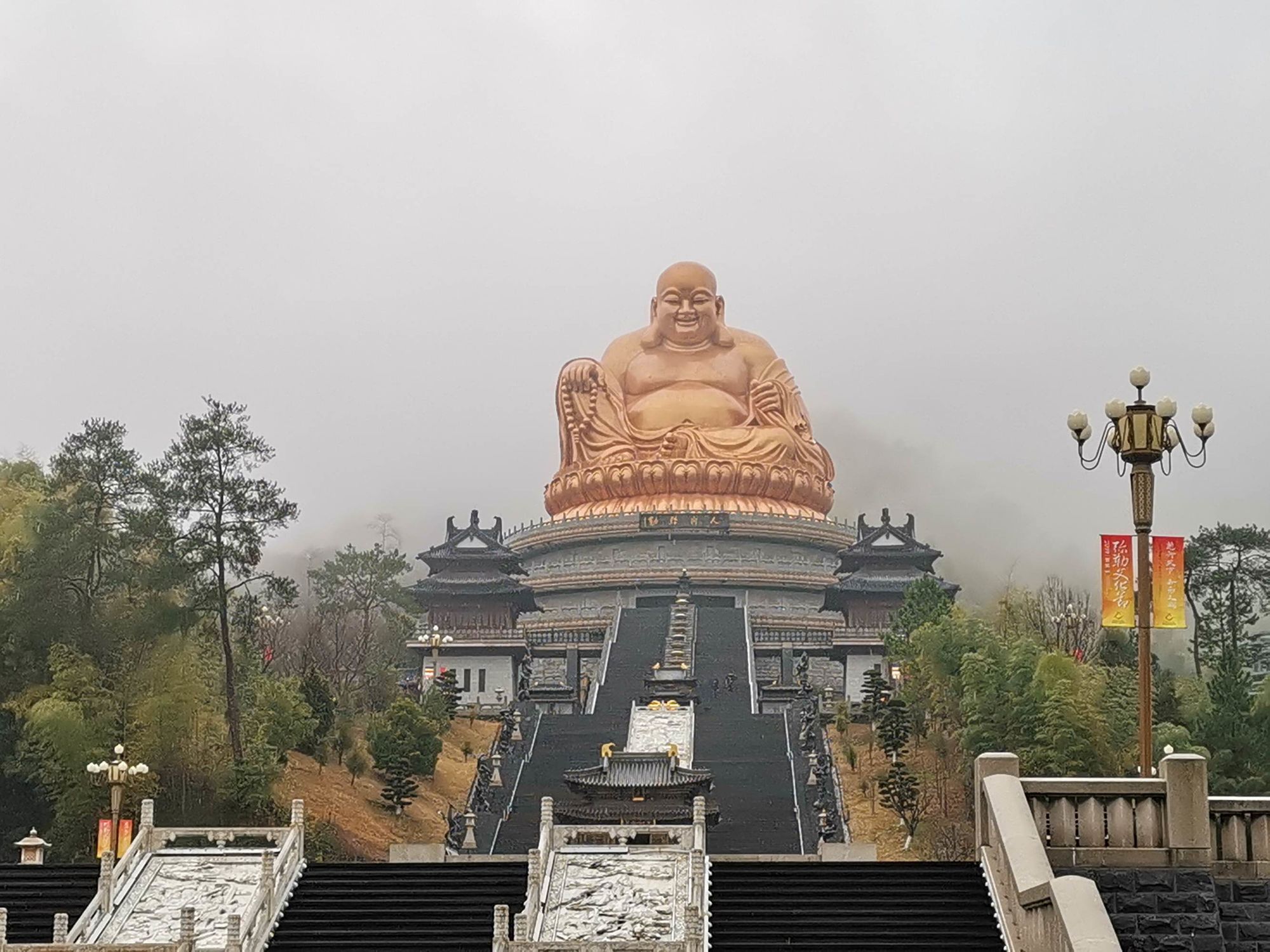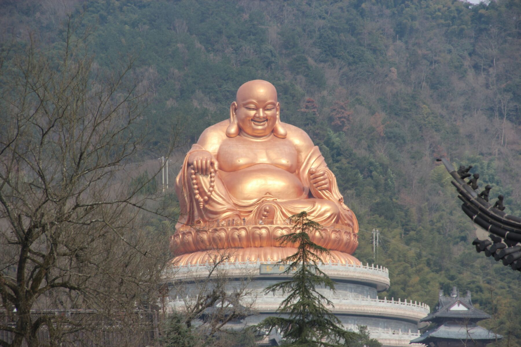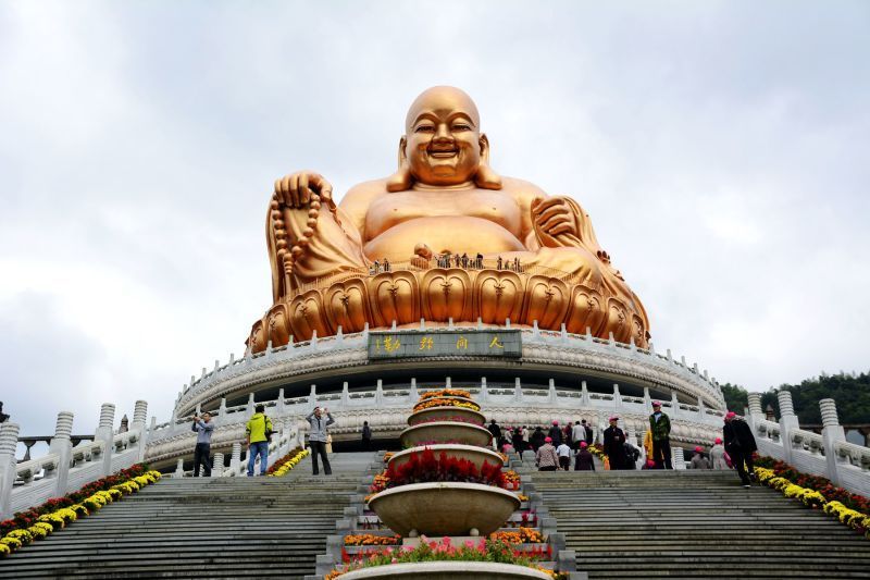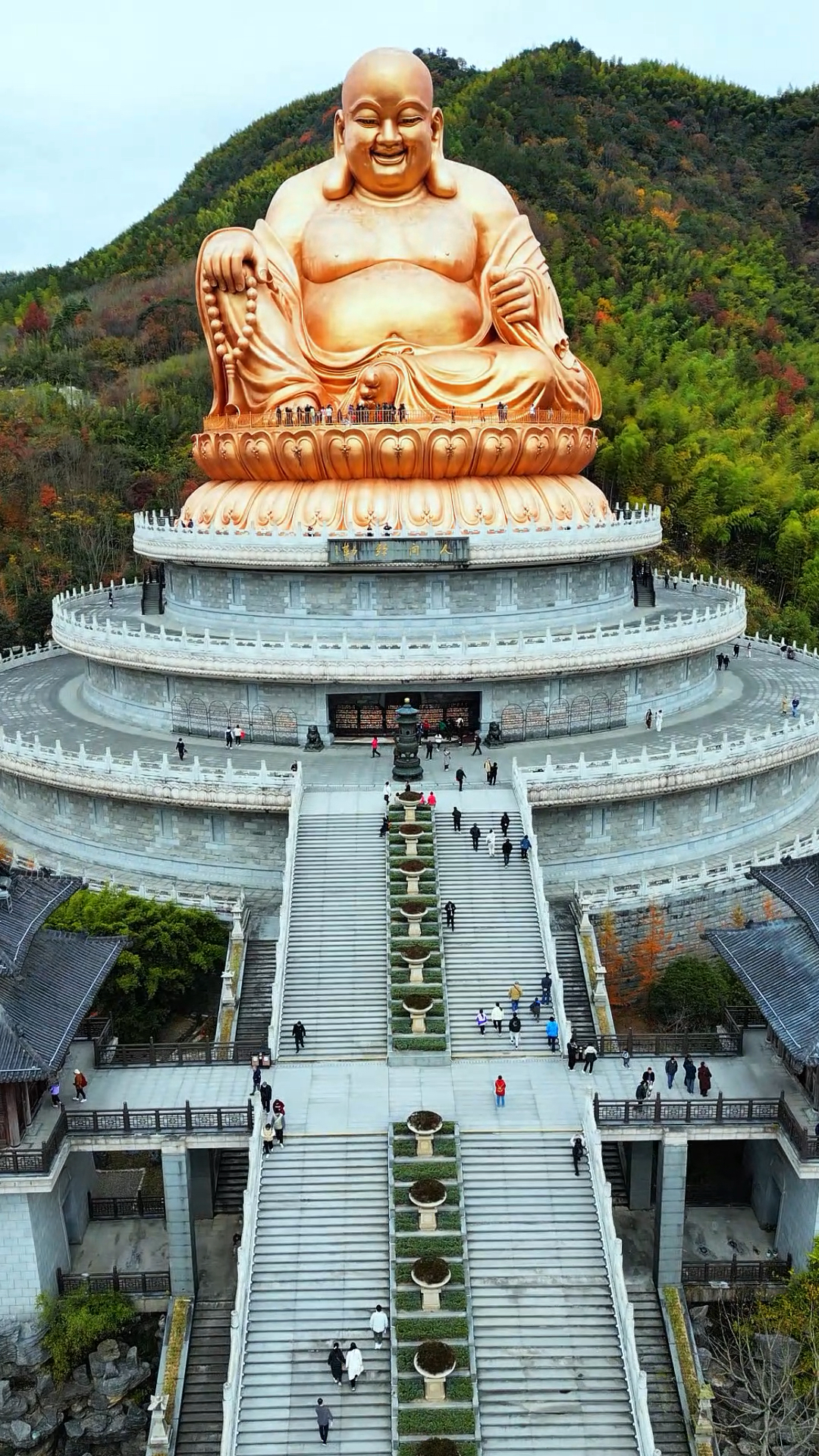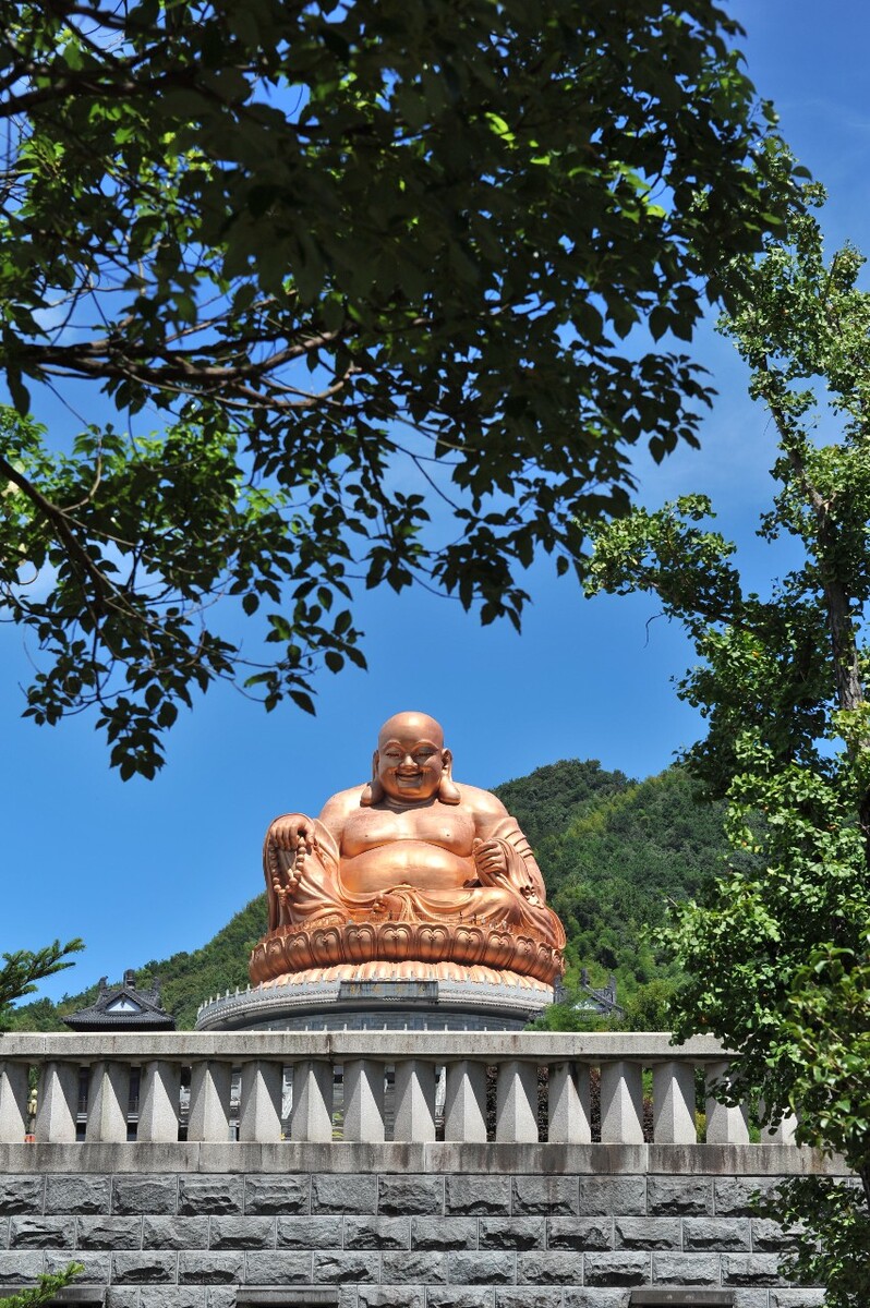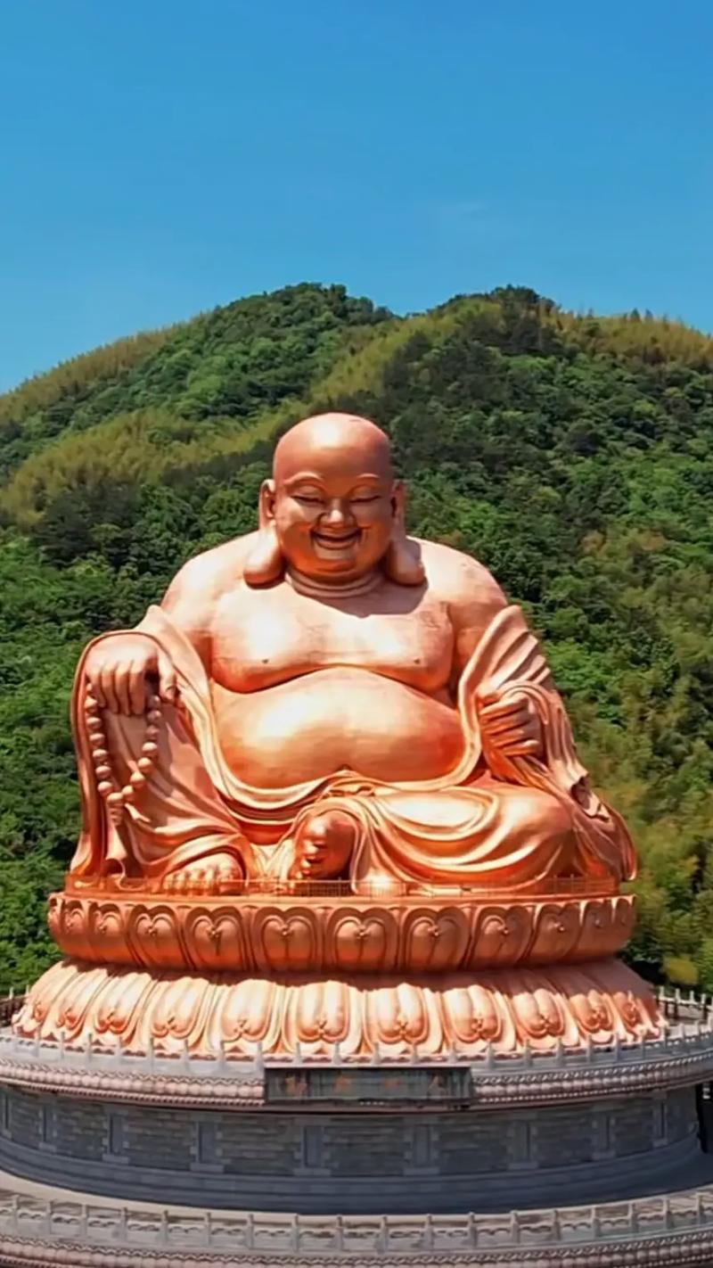 浙江奉化溪口雪窦山露天弥勒大佛,2008年建成,是典型的中国化弥勒佛像。佛像具有比丘相、罗汉身、菩萨意、布袋形、佛之像。大佛用500多吨锡青铜铸造,佛像身高33米,表示弥勒身居33层天;莲花座高9米,另加基座14.74米,共56.74米。佛像集壮观、神圣、雄伟、高大于一身,为天下铜铸座像之最。奉化是佛教界普遍认同的弥勒化身--布袋和尚的家乡,留有许多布袋弥勒的文化遗迹。