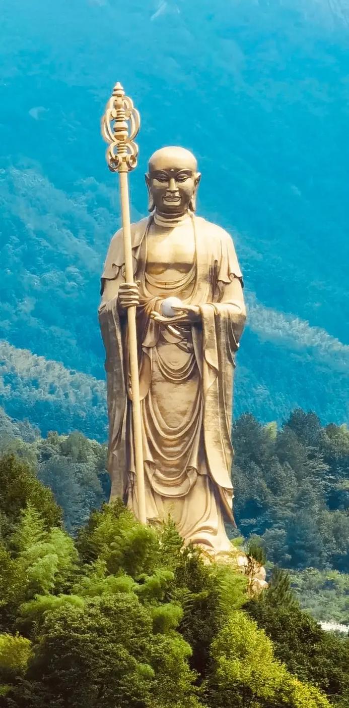 安徽九华山地藏菩萨露天大铜像,位于安徽池州市九华山下柯村景区,为比丘立相,右手执锡杖,左手托摩尼宝珠,仪态安详,妙相庄严。铜像气势恢弘,高达99米,与九华山99座山峰、金地藏享年99岁的寓意相一致。铜像采用铸造方式,选用仿金铜,2003年11月13日开工,到2009年3月铜像主体结构完工,2013年9月1日开光。