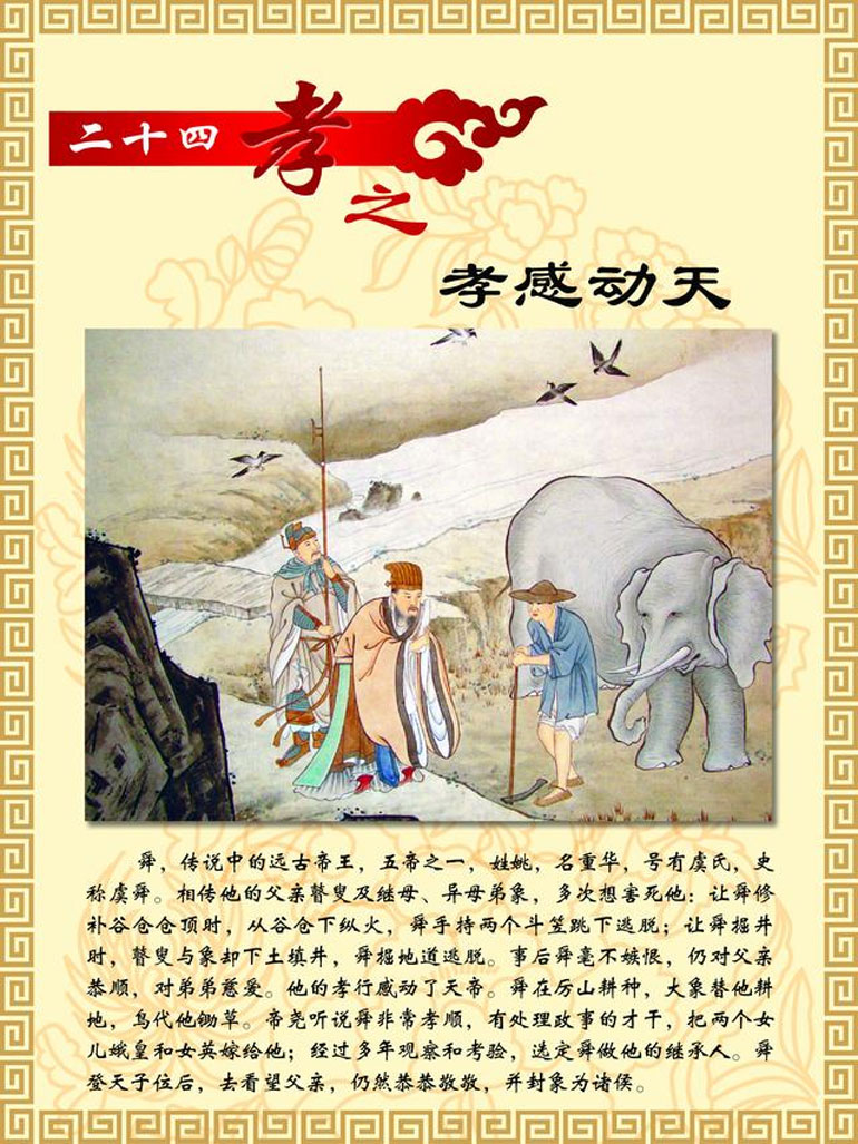 舜,传说中的远古帝王,五帝之一,姓姚,名重华,号有虞氏,史称虞舜。相传他的父亲瞽叟及继母、异母弟象,多次想害死他:让舜修补谷仓仓顶时,从谷仓下纵火,舜手持两个斗笠跳下逃脱;让舜掘井时,瞽叟与象却下土填井,舜掘地道逃脱。事后舜毫不嫉恨,仍对父亲恭顺,对弟弟慈爱。他的孝行感动了天帝。舜在历山耕种,大象替他耕地,鸟代他锄草。帝尧听说舜非常孝顺,有处理政事的才干,把两个女儿娥皇和女英嫁给他;经过多年观察和考验,选定舜做他的继承人。舜登天子位后,去看望父亲,仍然恭恭敬敬,并封象为诸侯。