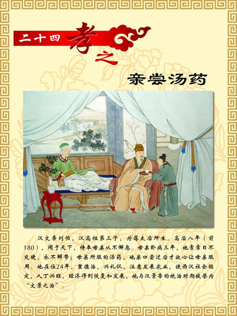 汉文帝刘恒,汉高祖第四子,为薄太后所生。高后八年(前180年)即帝位。他以仁孝之名,闻于天下,侍奉母亲从不懈怠。母亲卧病三年,他常常目不交睫,衣不解带;母亲所服的汤药,他亲口尝过后才放心让母亲服用。他在位24年,重德治,兴礼仪,注意发展农业,使西汉社会稳定,人丁兴旺,经济得到恢复和发展,他与汉景帝的统治时期被誉为"文景之治"。