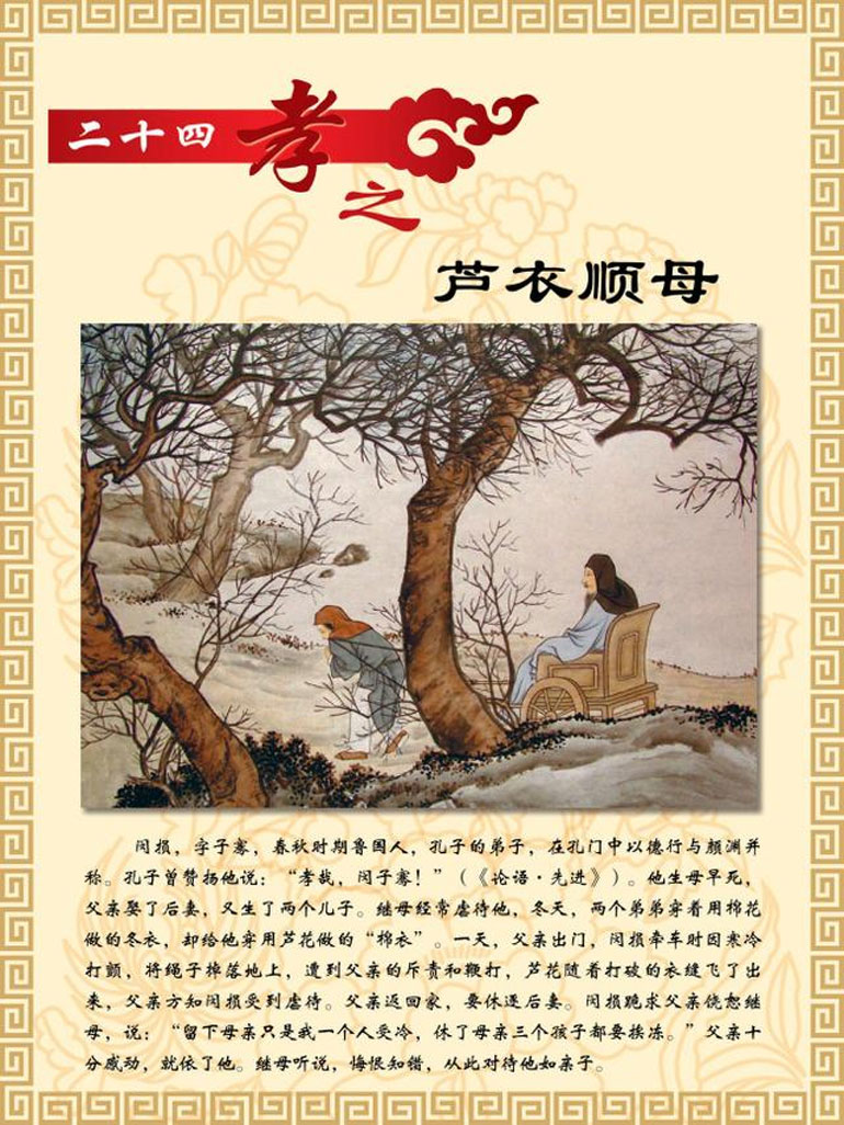 闵损,字子骞,春秋时期鲁国人,孔子的弟子,在孔门中以德行与颜渊并称。孔子曾赞扬他说:"孝哉,闵子骞!"(《论语·先进》)。他生母早死,父亲娶了后妻,又生了两个儿子。继母经常虐待他,冬天,两个弟弟穿着用棉花做的冬衣,却给他穿用芦花做的"棉衣"。一天,父亲出门,闵损牵车时因寒冷打颤,将绳子掉落在地上,遭到父亲的斥责和鞭打,芦花随着打破的衣缝飞了出来,父亲方知闵损受到虐待。父亲返回家,要休逐后妻。闵损跪求父亲饶恕继母,说:"留下母亲只是我一个人受冷,休了母亲三个孩子都要挨冻。"父亲十分感动,就依了他。继母听说,悔恨知错,从此对待他如亲子。