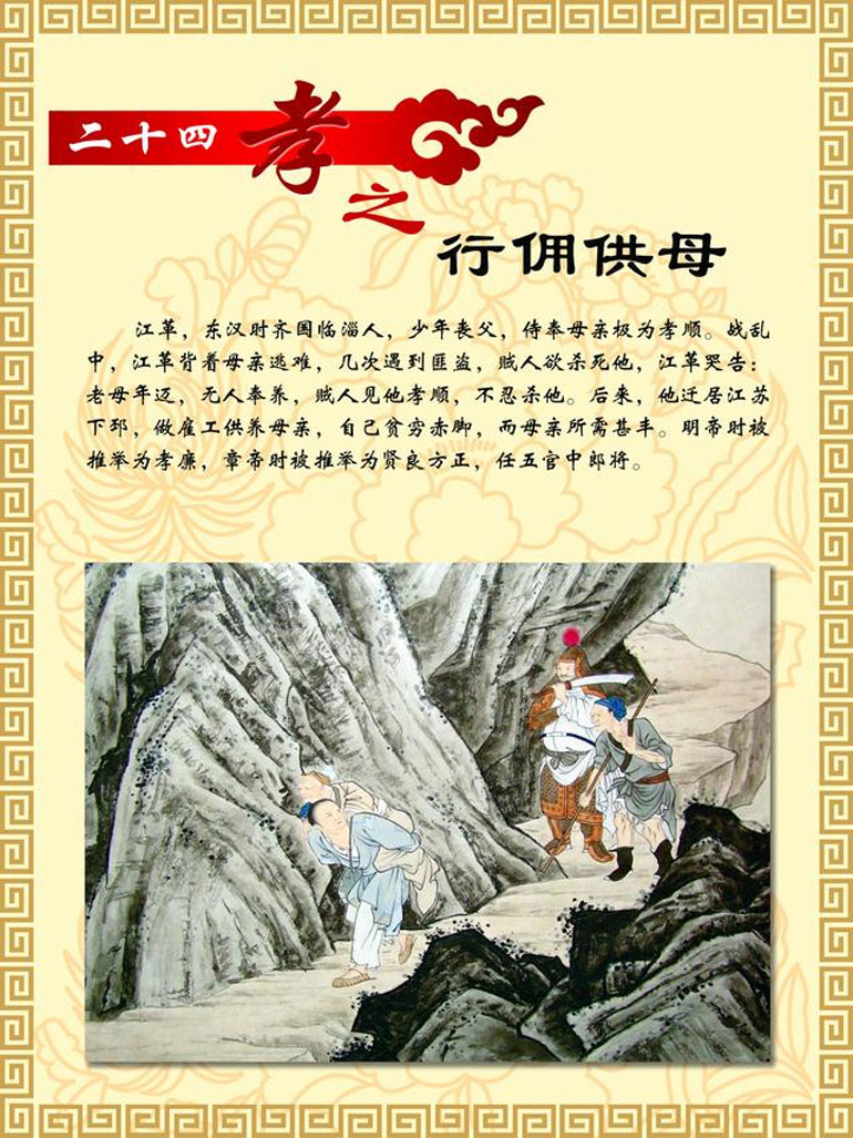 江革,东汉时齐国临淄人,少年丧父,侍奉母亲极为孝顺。战乱中,江革背着母亲逃难,几次遇到匪盗,贼人欲杀死他,江革哭告:老母年迈,无人奉养,贼人见他孝顺,不忍杀他。后来,他迁居江苏下邳,做雇工供养母亲,自己贫穷赤脚,而母亲所需甚丰。明帝时被推举为孝廉,章帝时被推举为贤良方正,任五官中郎将。