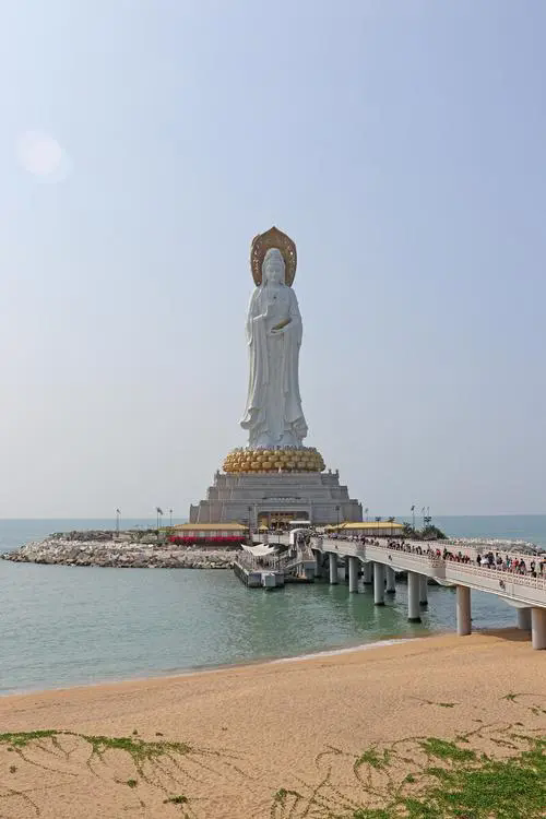 海南观音:海南三亚南海海上观音像,钢筋混凝土材料,高达108米,比美国的自由女神像还要高15米。2005年4月24日举行开光大典。像体为正观音的一体化三尊造型,宝相庄严,脚踏108瓣莲花宝座,宝座下为金刚台,金刚台内是面积达15000平方米的圆通宝殿。南海观音像通过高科技手法,组合运用声、光、电技术,进行大型灯光夜景演示,充分展示了“佛光普照”的效果。